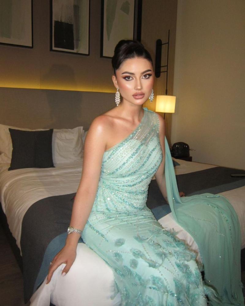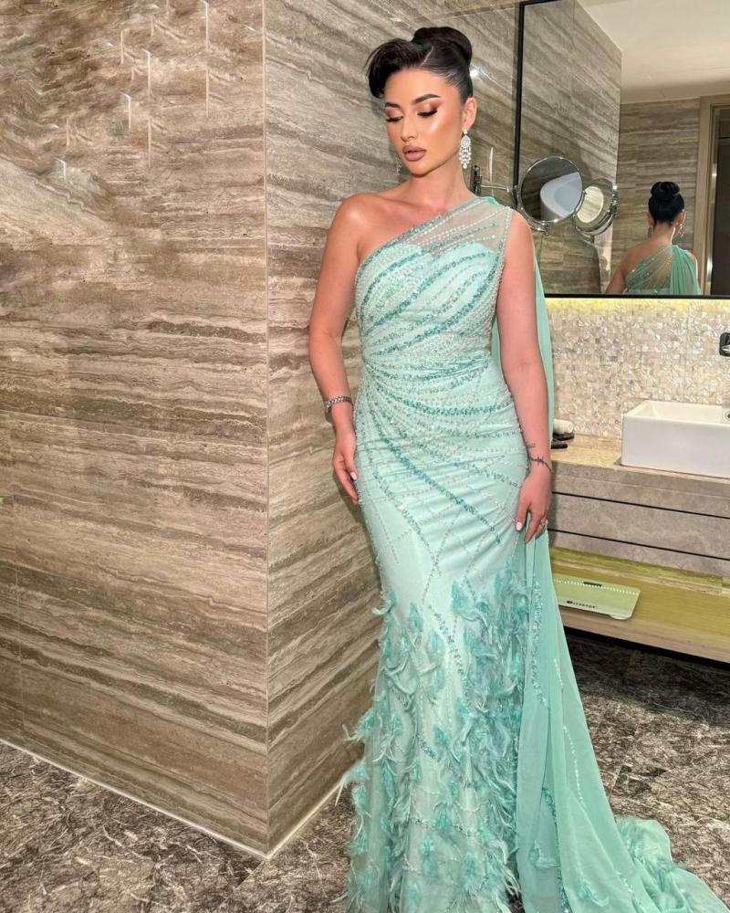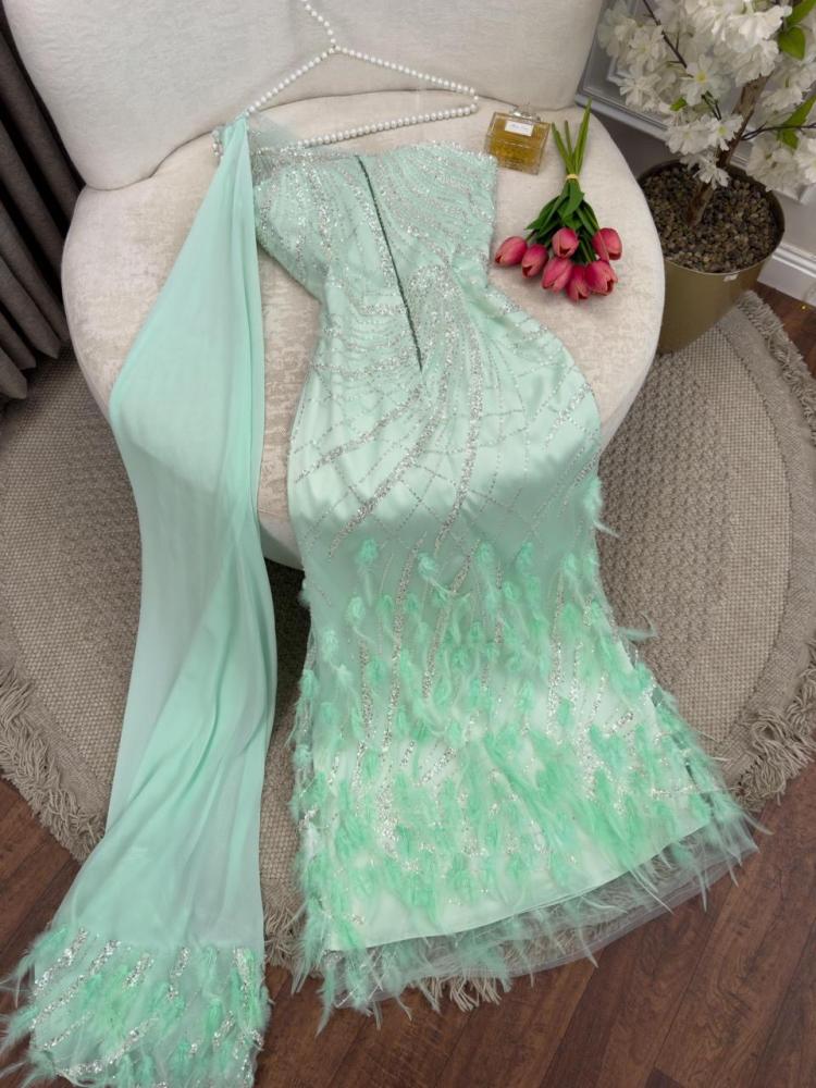 فستان سهره لون تيفاني مطرز يدوي +ريش