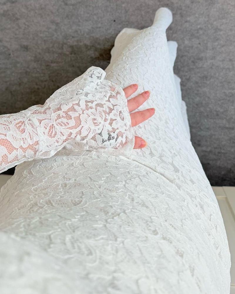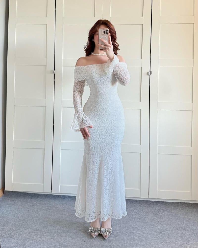 * القماش: يبدو أن الفستان مصنوع من قماش الدانتيل الأبيض، مما يضفي عليه مظهرًا أنيقًا ورقيقًا.