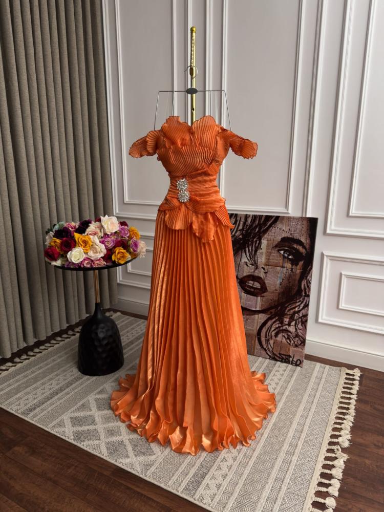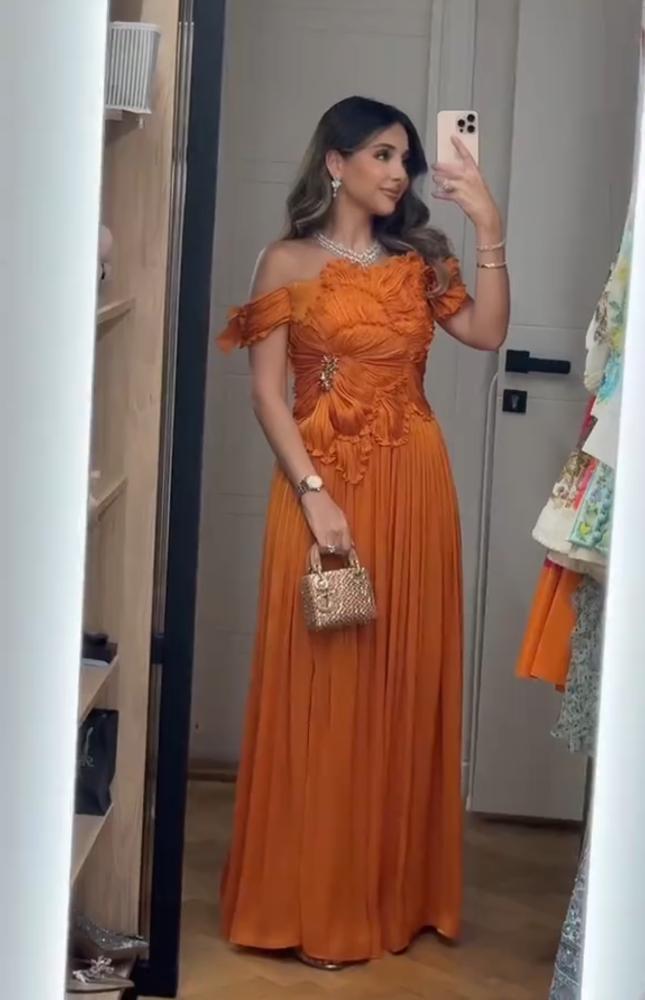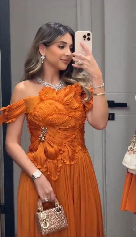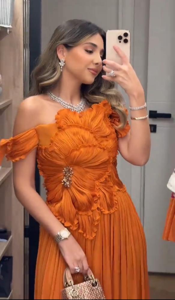 - تصميم الصدر مزخرف: بطيّات على شكل وردة كبيرة مع بروش كريستالي.