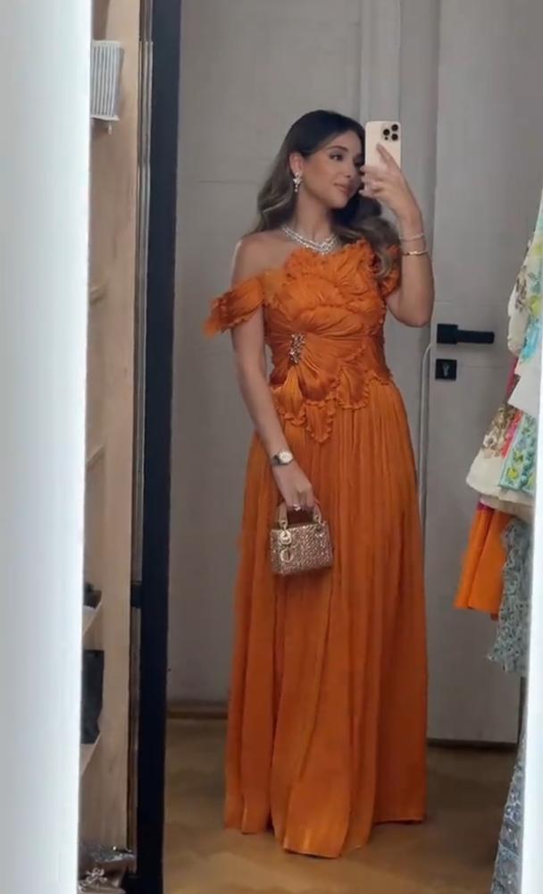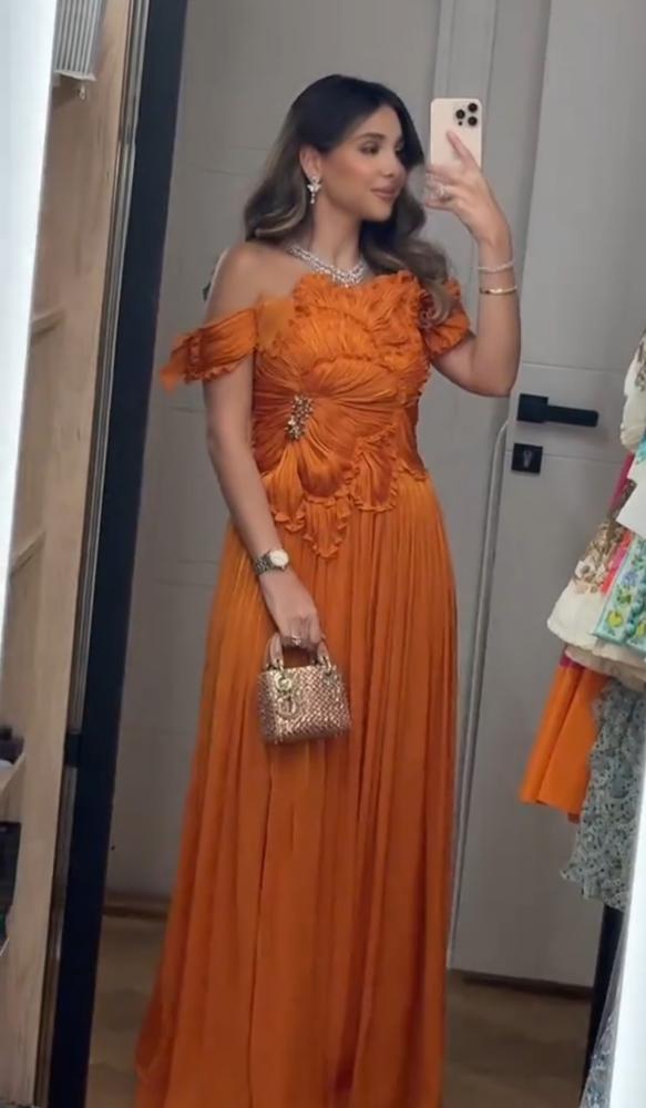 - تنسيق مع حقيبة صغيرة فاخرة مطرزة وحذاء بالكعب العالي.