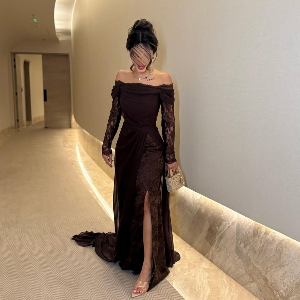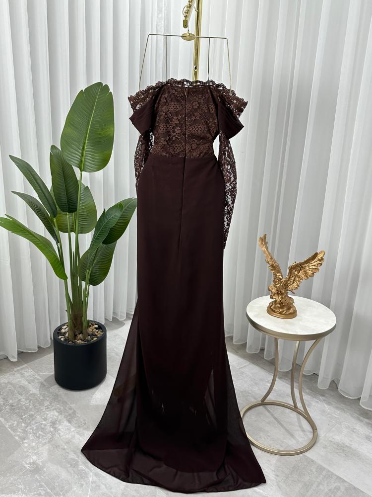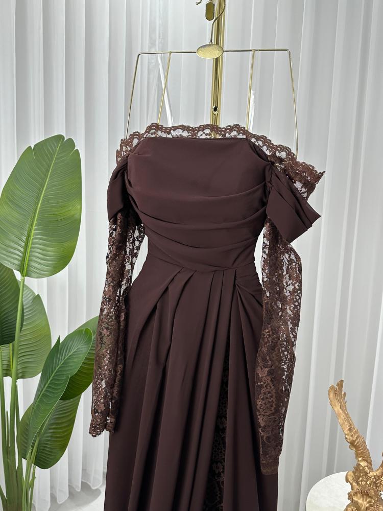 * اللون: يأتي الفستان بلون بني غني وجذاب، وهو لون كلاسيكي وأنيق يناسب مختلف المناسبات.