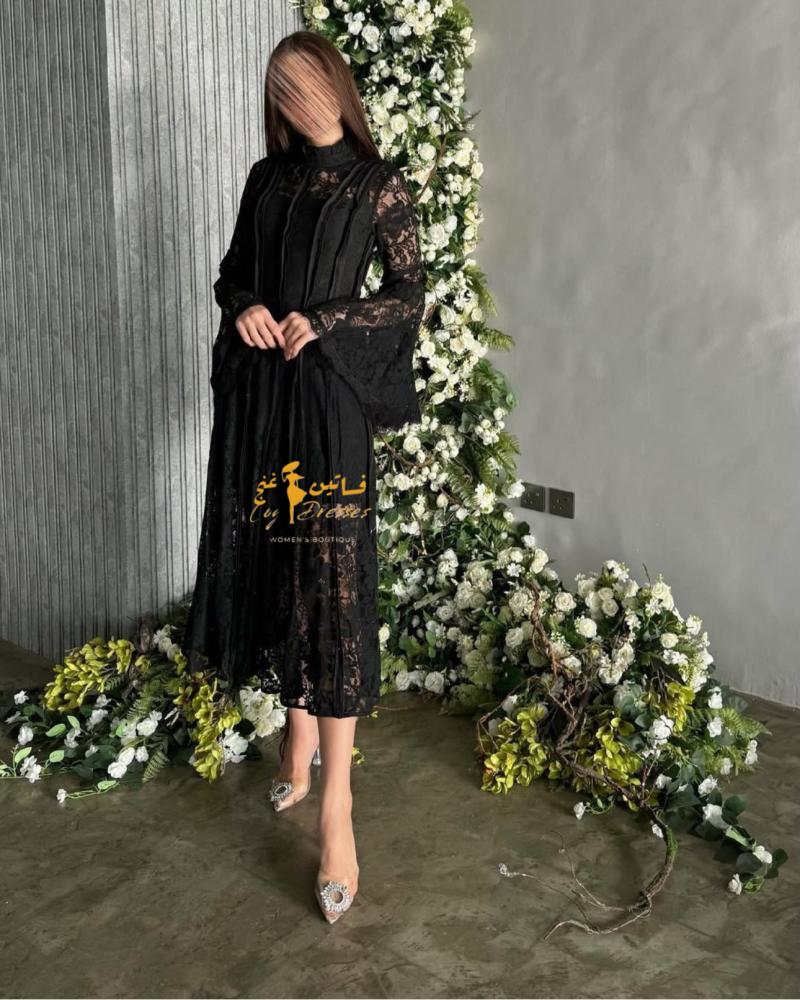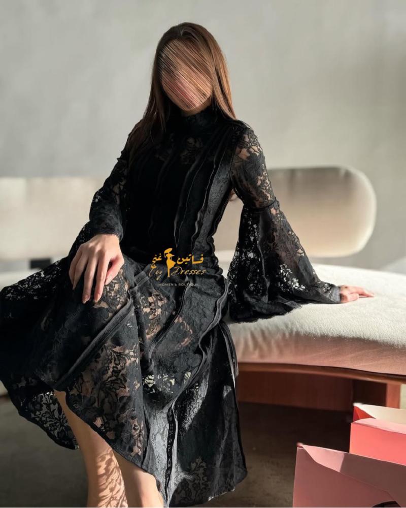 * التصميم: فستان أسود مصنوع من الدانتيل الأصلي عالي الجودة. يتميز بتصميم أنيق وأنثوي، يصل طوله إلى 120 سم، مما يجعله مناسبًا لمختلف المناسبات.