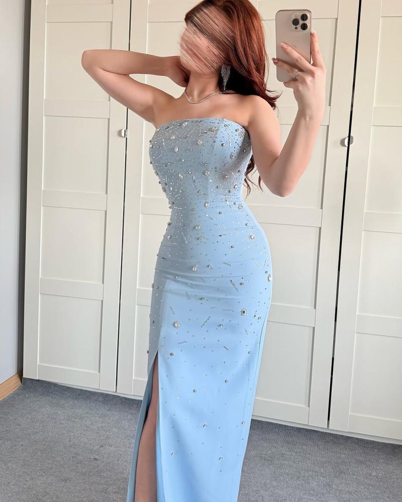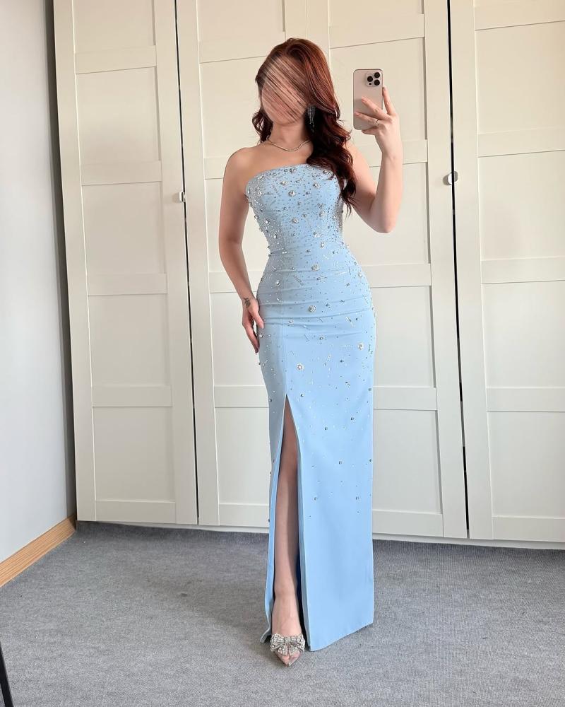 * التصميم: فستان سهرة طويل بتصميم أنيق وأنثوي، يجمع بين الرقي والبساطة. يتميز الفستان بقصة صدر مستقيمة أو بتصميم آخر تختارونه، مع تنورة طويلة واسعة أو بتصميم حورية البحر لإطلالة جذابة.