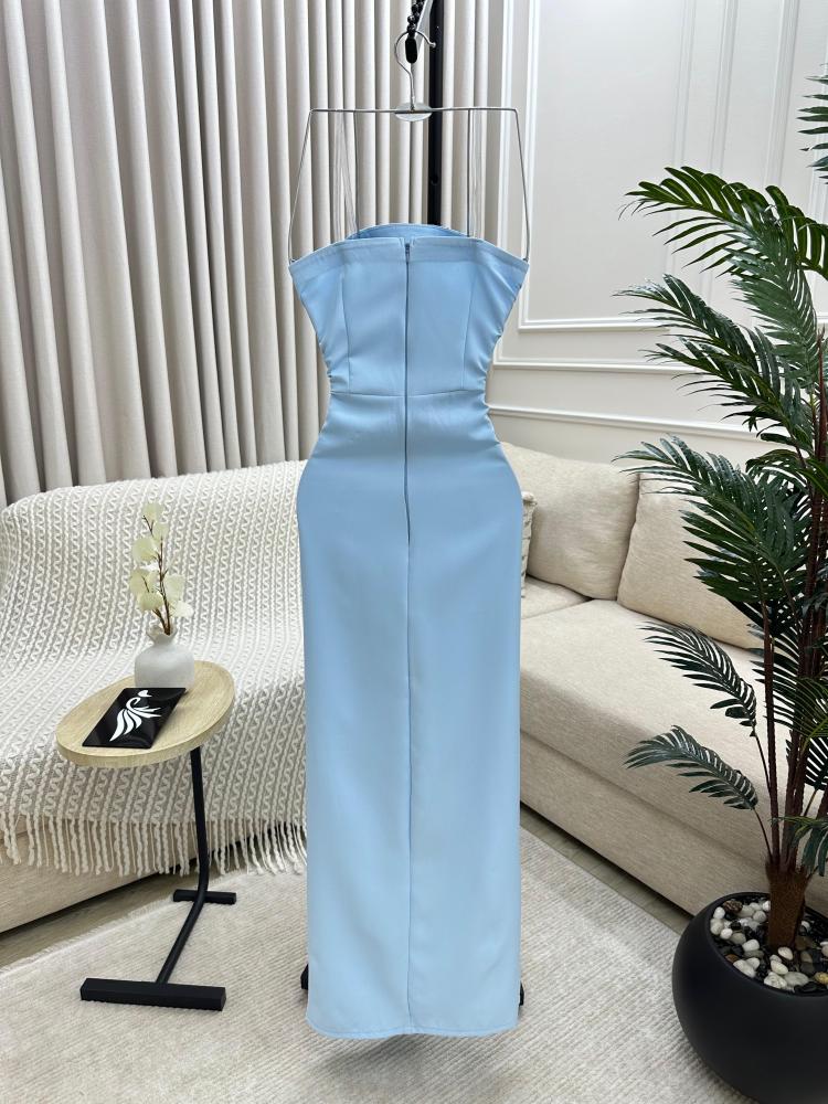 * اللون: لون أزرق فاتح (يمكن ذكر ألوان أخرى متوفرة). لون كلاسيكي يضفي على الفستان لمسة من الأناقة والرقي.